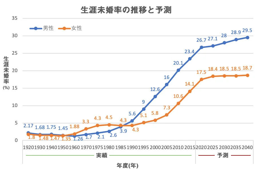 > 現状では、日本人男性の3人に1人、29%ほどが2030年には独身のまま一生を終える生涯未婚になると予想されている。