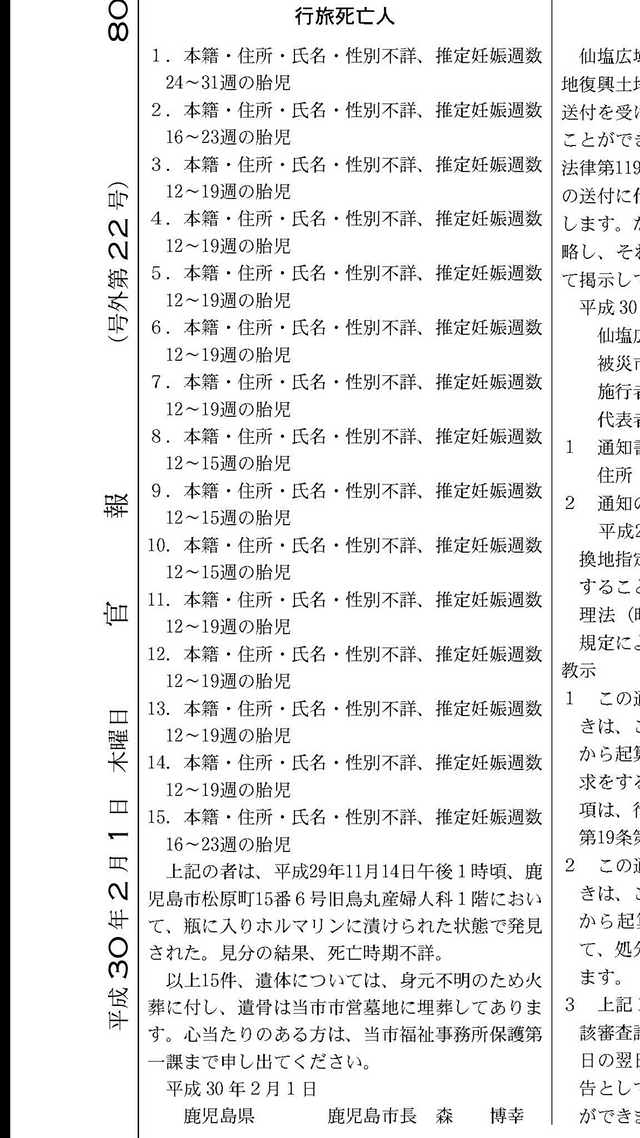 以上2件、遺体は火葬に付し、遺骨は保管してありますので、お心当たりの方は当市福祉部社会福祉課まで申し出て 下さい。