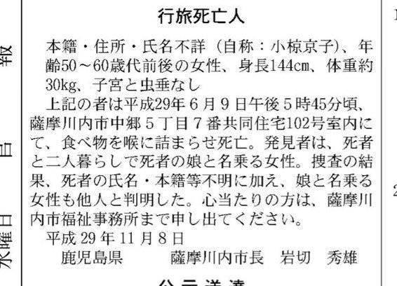上記の者は、平成28年12月26日午後2時頃、鹿児島県姶良市西餅田〇〇番地の住宅内で半ミイラ化 している状態で発見されました。死亡推定日は同年8月下旬頃。身元不明のため遺体は火葬に付し、 遺骨は姶良市加治木町錦江町に埋葬してあります。心当たりの方は、当市社会福祉課まで申し出てください。
