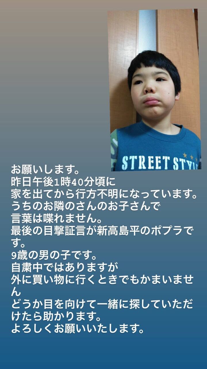 ちなみに伸矢 くんは4歳とは思えないくらい、しっかりしていた。自宅の住所も電話番号も年齢も家族の名前もみんな言えた。