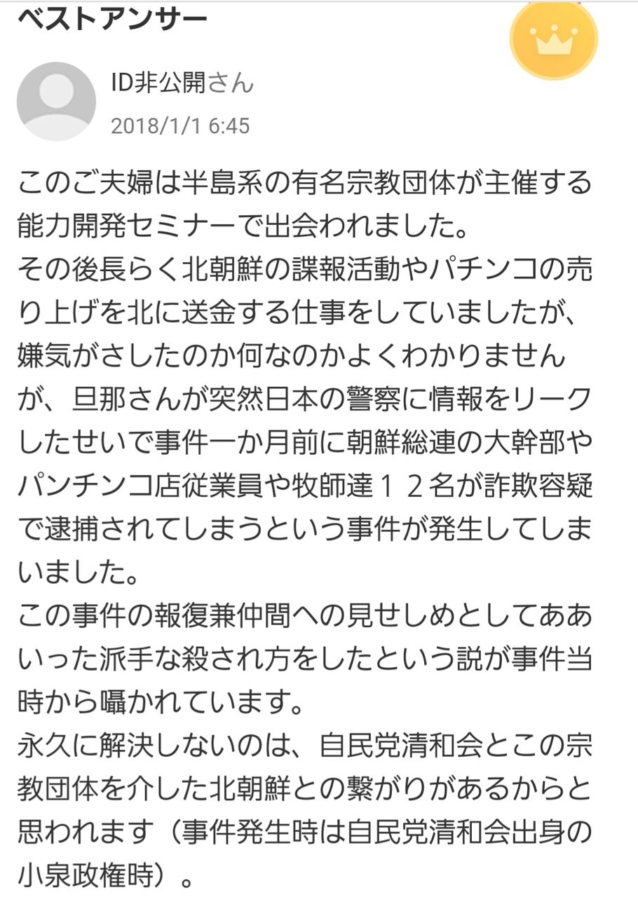 この事件検索するとサジェストに「統一教会」「韓国マフィア」「オウム」「姉の息子」とか色々出るから確定した情報なんてないんだろ