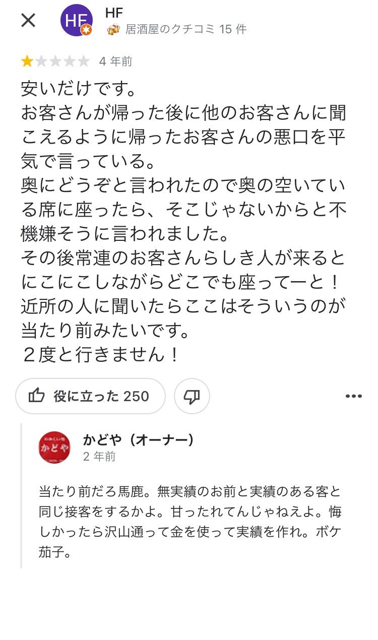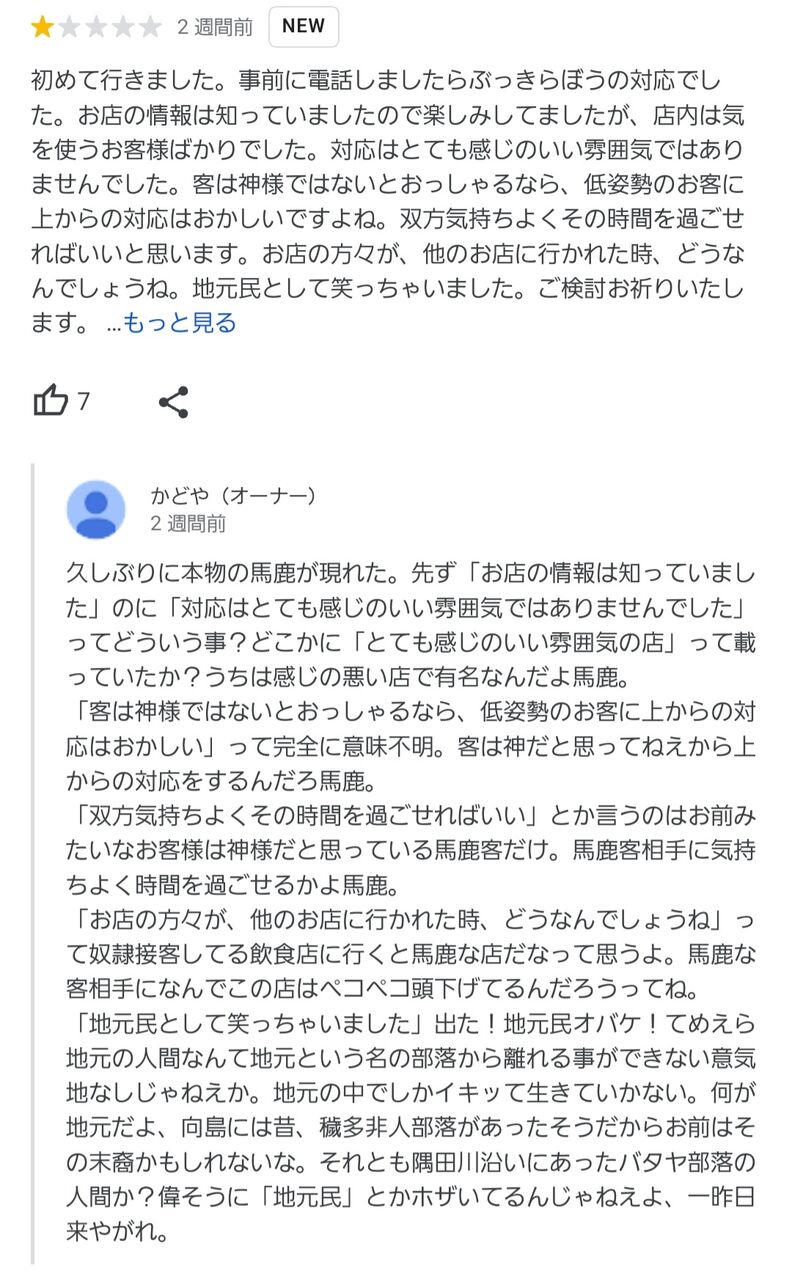 数年前に来たクソ客がワガママばかり言ってくるから冷たく扱ったら「私たち地元の人間だから気をつけた方がいいよ。悪い噂はすぐ広まるからね」ってクソみたいな脅し文句を言ってきたけど、地元の部落に寄生虫みたくへばり付かないと生きていけないクソ人間とその仲間達なんて、こちらからお断りだよ。