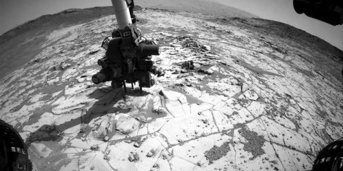 ちょうど機械の真ん中に見える細長いものが「キュリオシティ」の掘削ドリルだ。