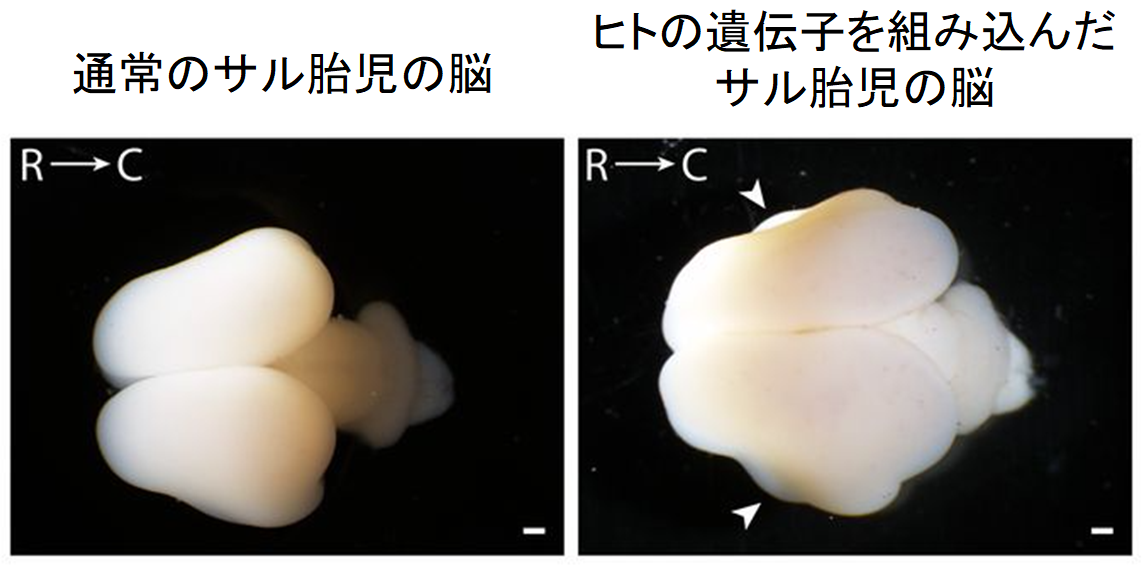 ドイツと日本の研究者は、ヒトとサルを分けた因子が互いに一致していない、残り1%の遺伝子の中にあるのではないかと考え、その中でも有力視されているARHGAP11B遺伝子をサルの受精卵に組み込みました。