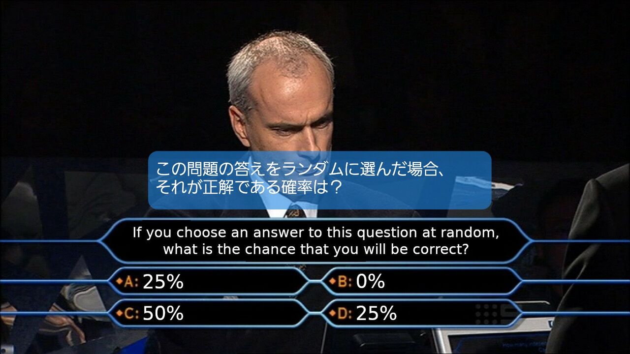 答えが50%だった場合ランダムに選んだら正答率は25%で矛盾するやん