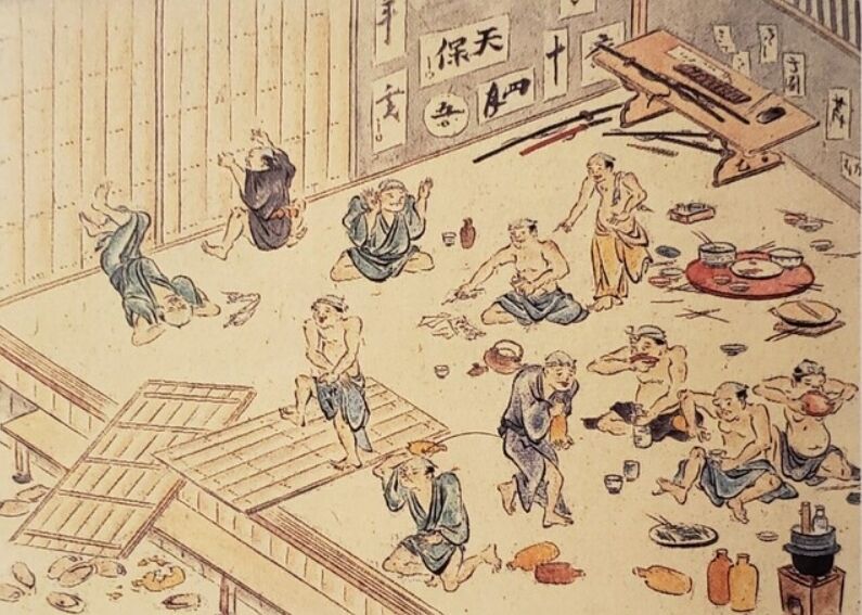 3年間単身赴任で江戸詰めしてた武士たちが参勤交代に合わせて国元に帰れるはずだったのに何らかの都合で延期になったので、やけ酒かっ喰らって暴れている図だったはず
