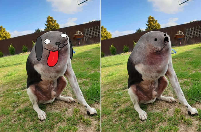 右前脚の無い犬が左方向に振り返ってるだけ