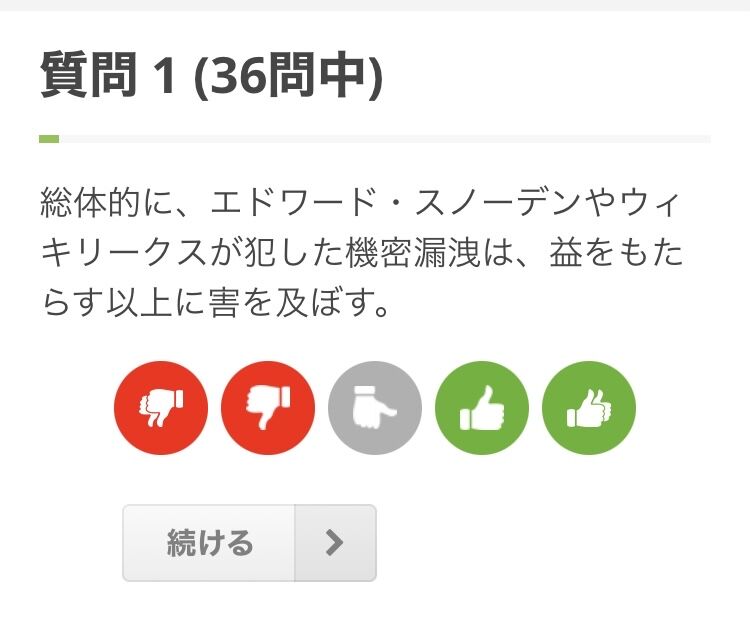 スノーデンに関する質問は自国の政府を裏切ってても不正を明かすことを良いと考えるかってことで、スノーデンを支持するなら自由主義にポイントが入る