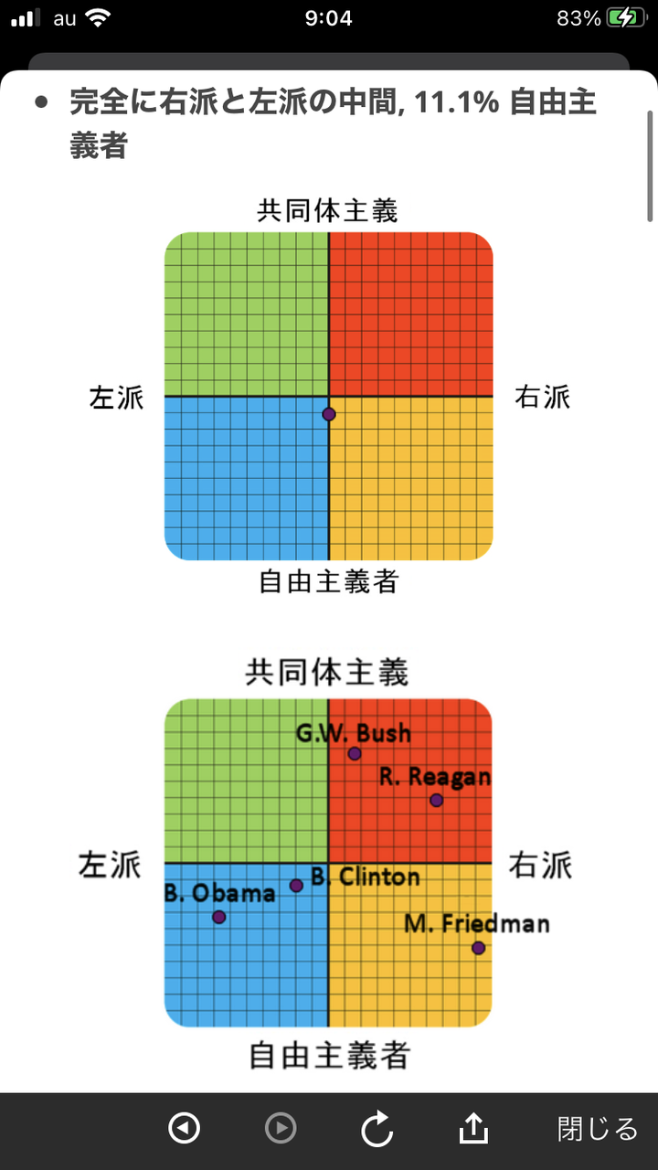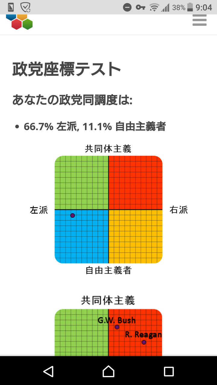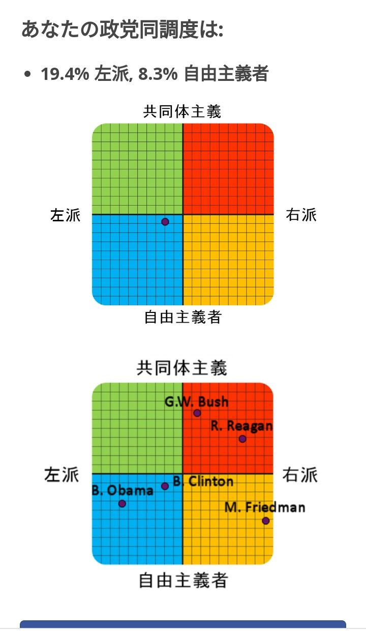 あなたの政党同調度は: 8.3% 左派, 38.9% 共同体主義