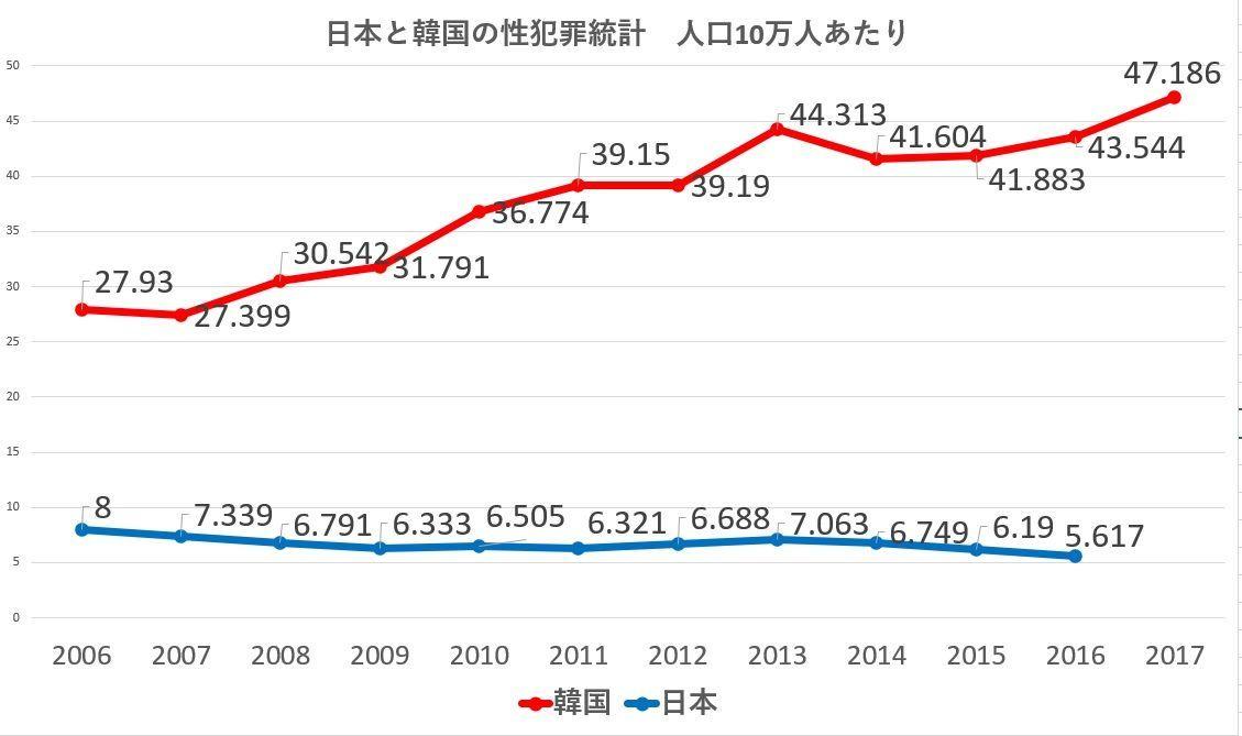 韓国では10万人当たりで33.7人が性被害にあっているとされる。OECD発表資料等によると、日本での強姦犯罪は10万人当たり2人以下となっている。韓国の性暴行発生率はアジアでは断トツの数字だ。