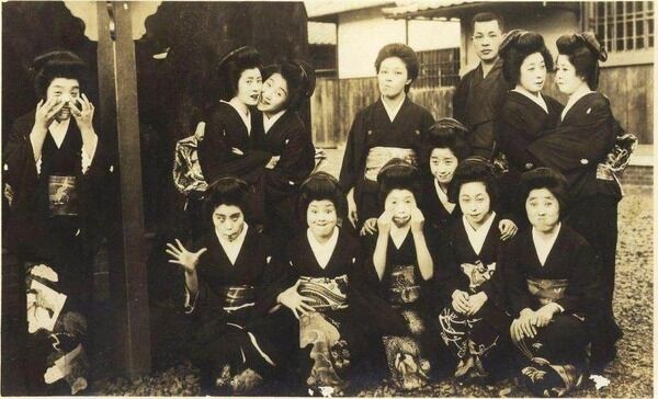 1900年に撮影されたこの写真では、15人の女性が真っすぐ向いて腕を組んでポーズをとっています。