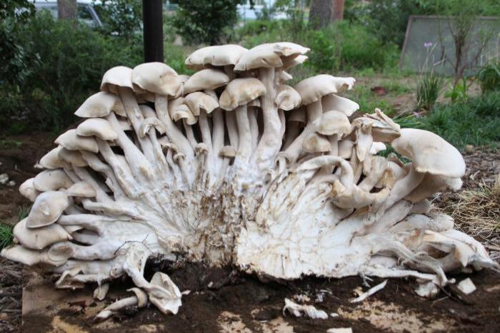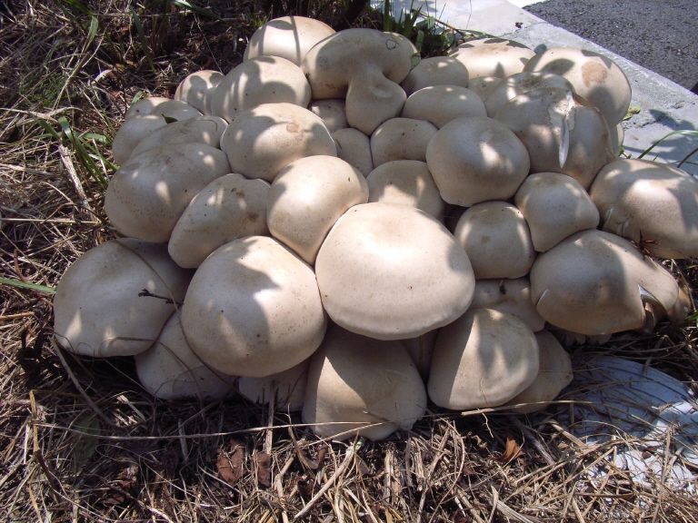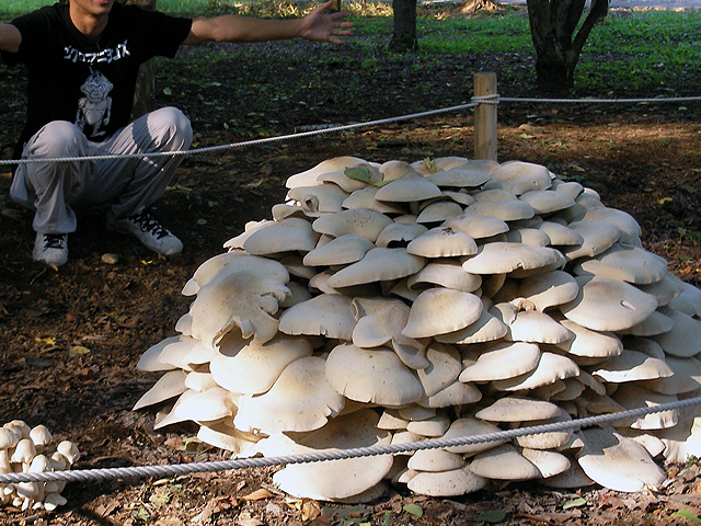 巨大キノコは、カサの直径15センチ前後の白色系のキノコが多数集まり、地面から束になって出ている。