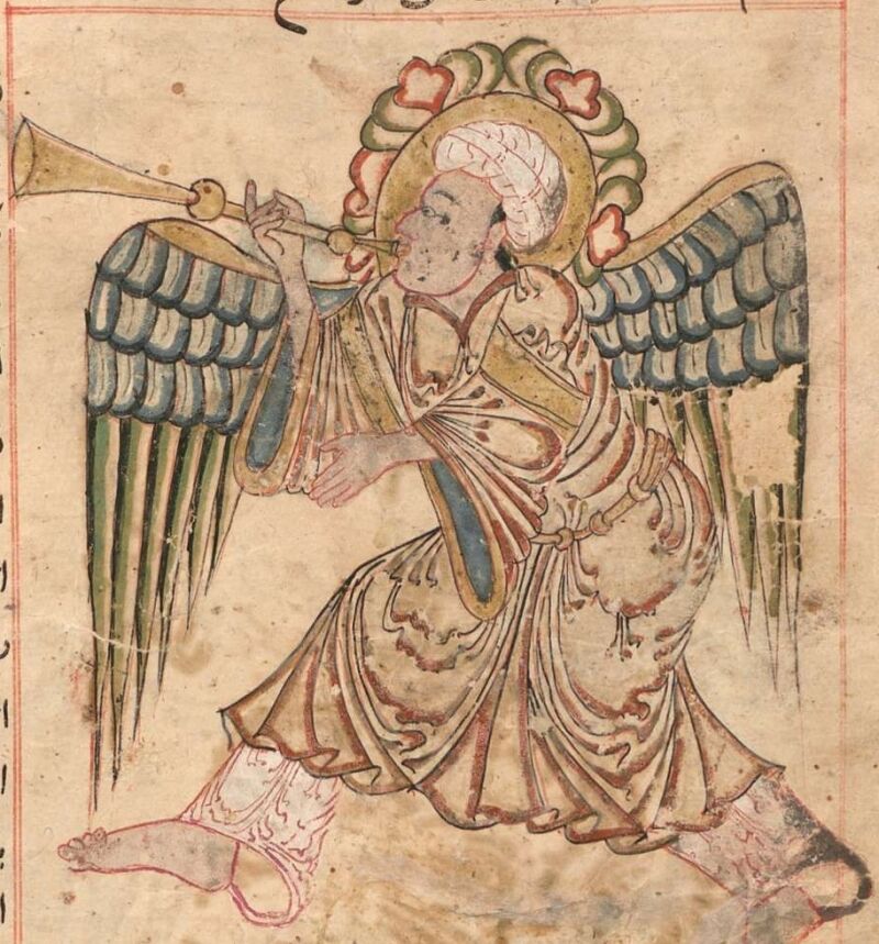 ①イスラム教において、最後の審判の裁きを知らせるラッパを吹くとされる天使