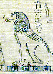 ②死者の心臓は冥界の神において「真実の羽根」とともに秤に乗せられ比べられる。心臓が羽根よりも重かったものは、この獣にむさぼり食われるという