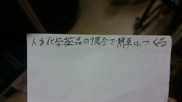 これは国内はもちろんのこと海外でも高い評価を受ける、あの東京大学で拾ったメモを撮影したものだ。メモには「人を化学薬品の調合で簡単につくる」と走り書きされている。