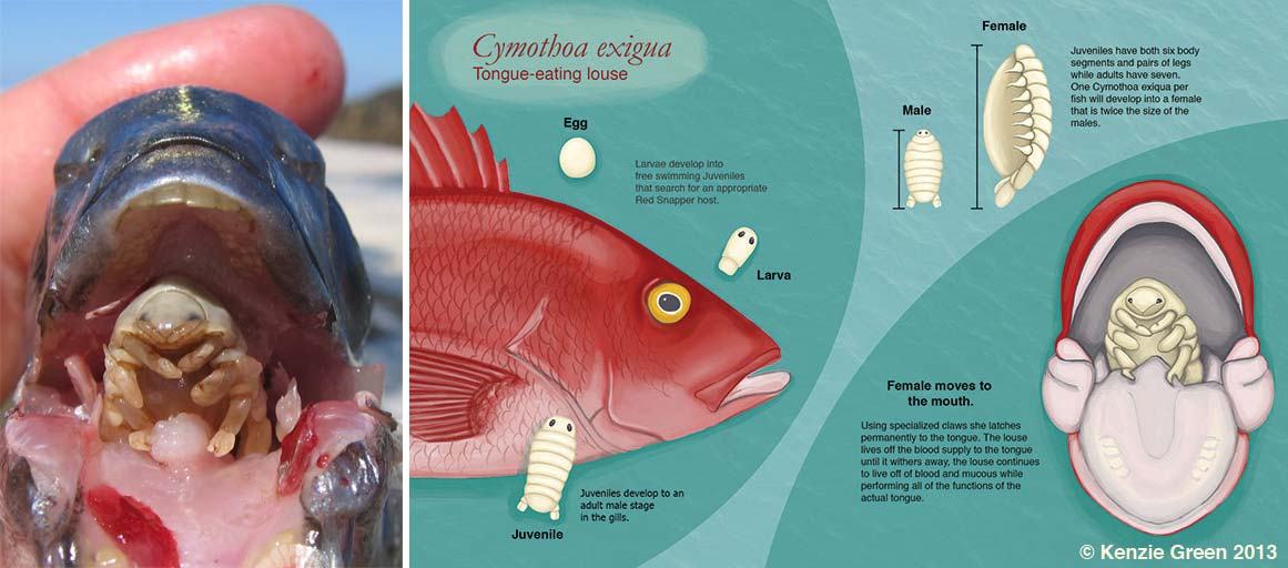 Cymothoa exiguaは、舌にある血管を切断して、舌を魚から切り落とす。そして最終的には、舌の代わりになる。