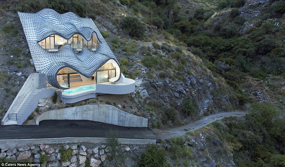 曲線の屋根、大きな窓、そして外側にはプールがあり、風変わりではありますが、壮大な景色を眺めるにはうってつけの物件です。