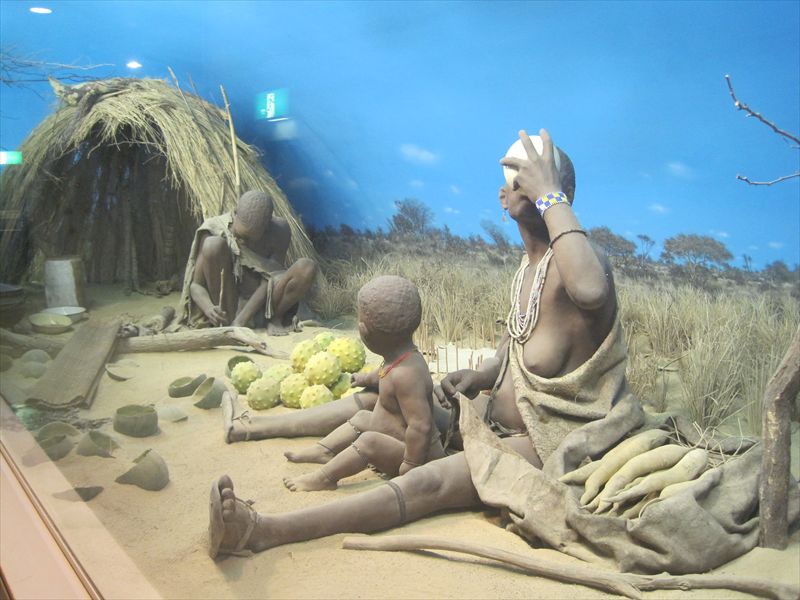 南アメリカ、ブッシュマンの人形とジオラマ。