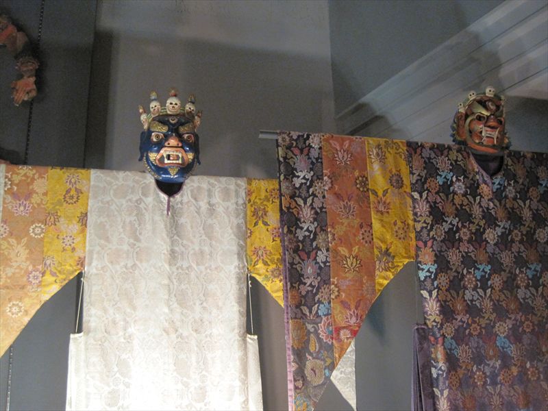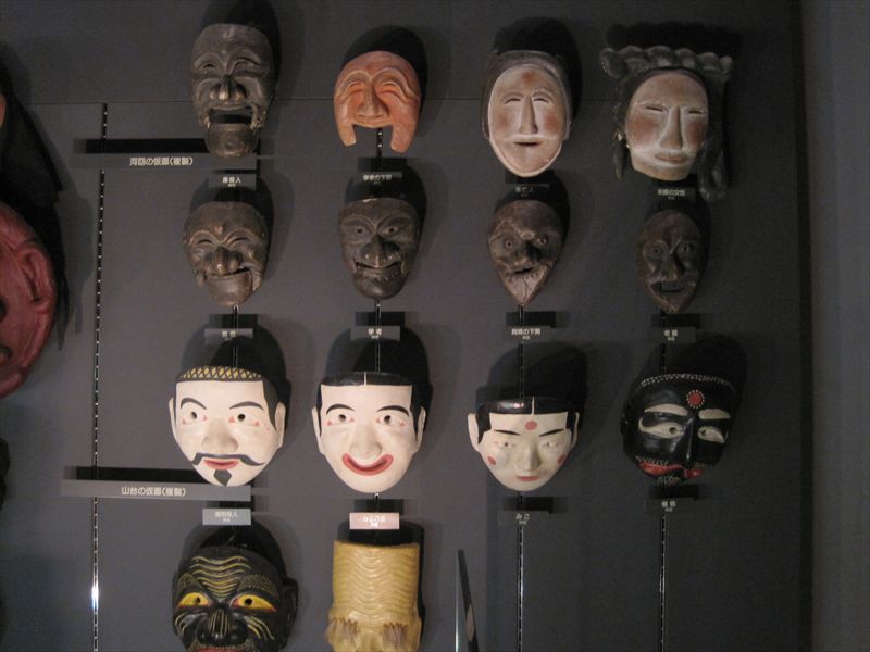 独特の雰囲気。劇自体を見ればそうでもないのでしょうが、仮面だけ並べられていると怖いです。
