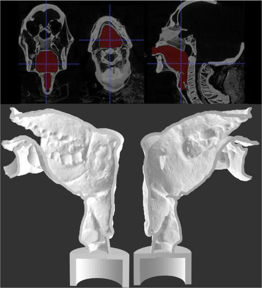 3000年前のミイラの声を再現するという研究では、ミイラをコンピュータ断層撮影(CT)スキャナーの中に入れ、断層撮影することでミイラの声道をスキャンし、その3Dモデルを作成しています。動物の声はこの声道の形状により異なってくるため、研究チームは声道を正確に再現することで「ミイラの声」を再現しようとしたわけです。