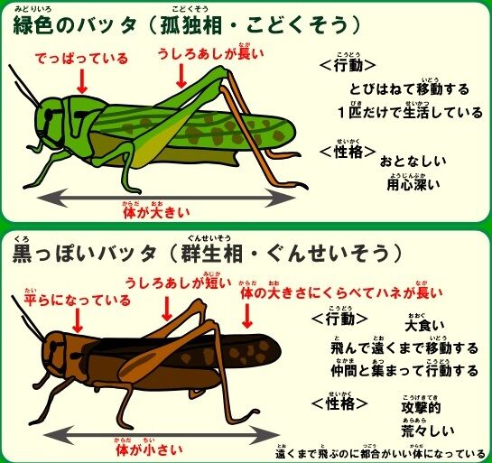 生まれた時環境で周りに仲間がいるかいないかで見た目と性格が大きく変わるのがバッタ