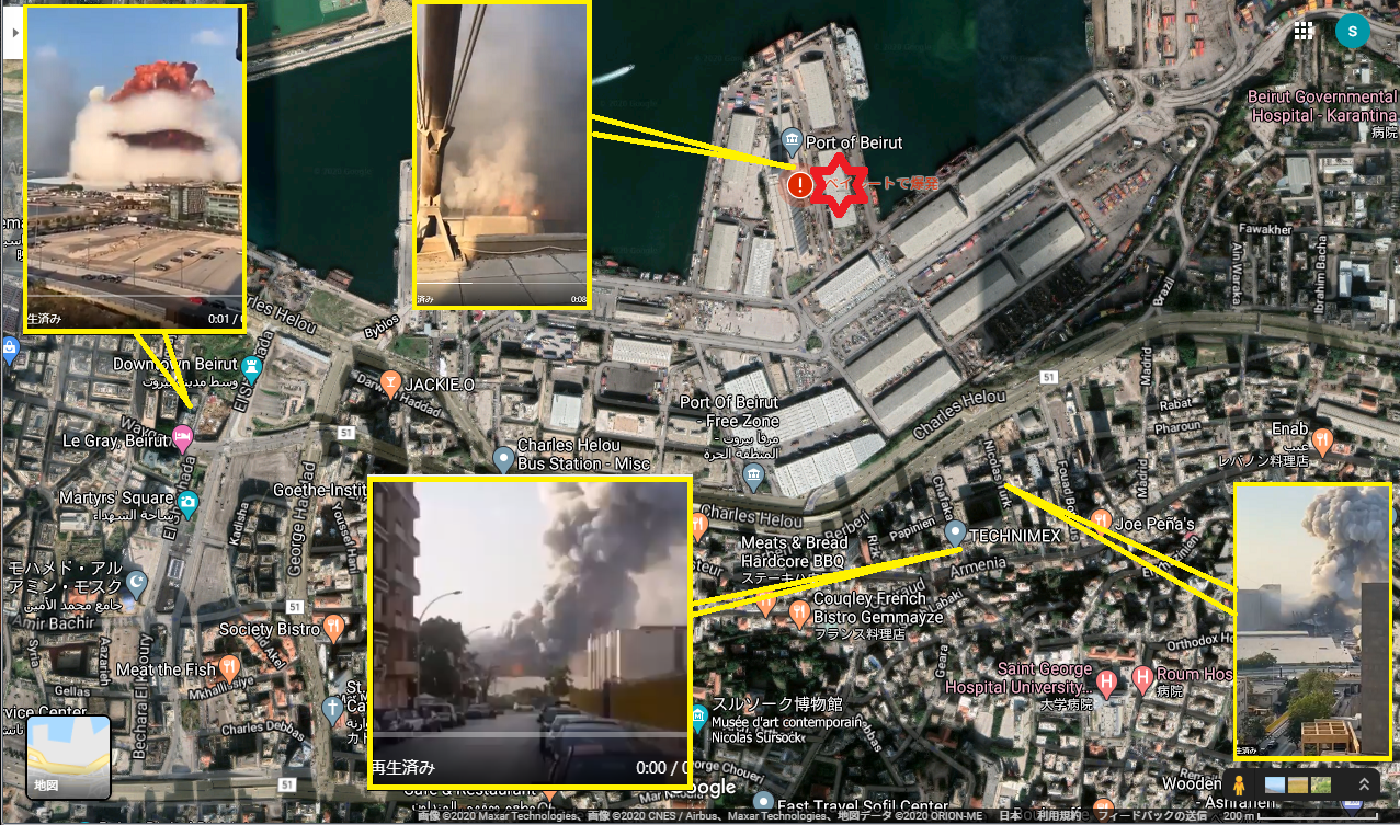 現地からの報道によると、SNSなどの映像では、白煙が上がる中で大きな爆発が起き、赤茶色い巨大な煙が立ち上った。爆発の衝撃で、周辺の多くの建物も被害を受けており、ベイルートのアブード知事は市が「被災地と化した」と述べた。