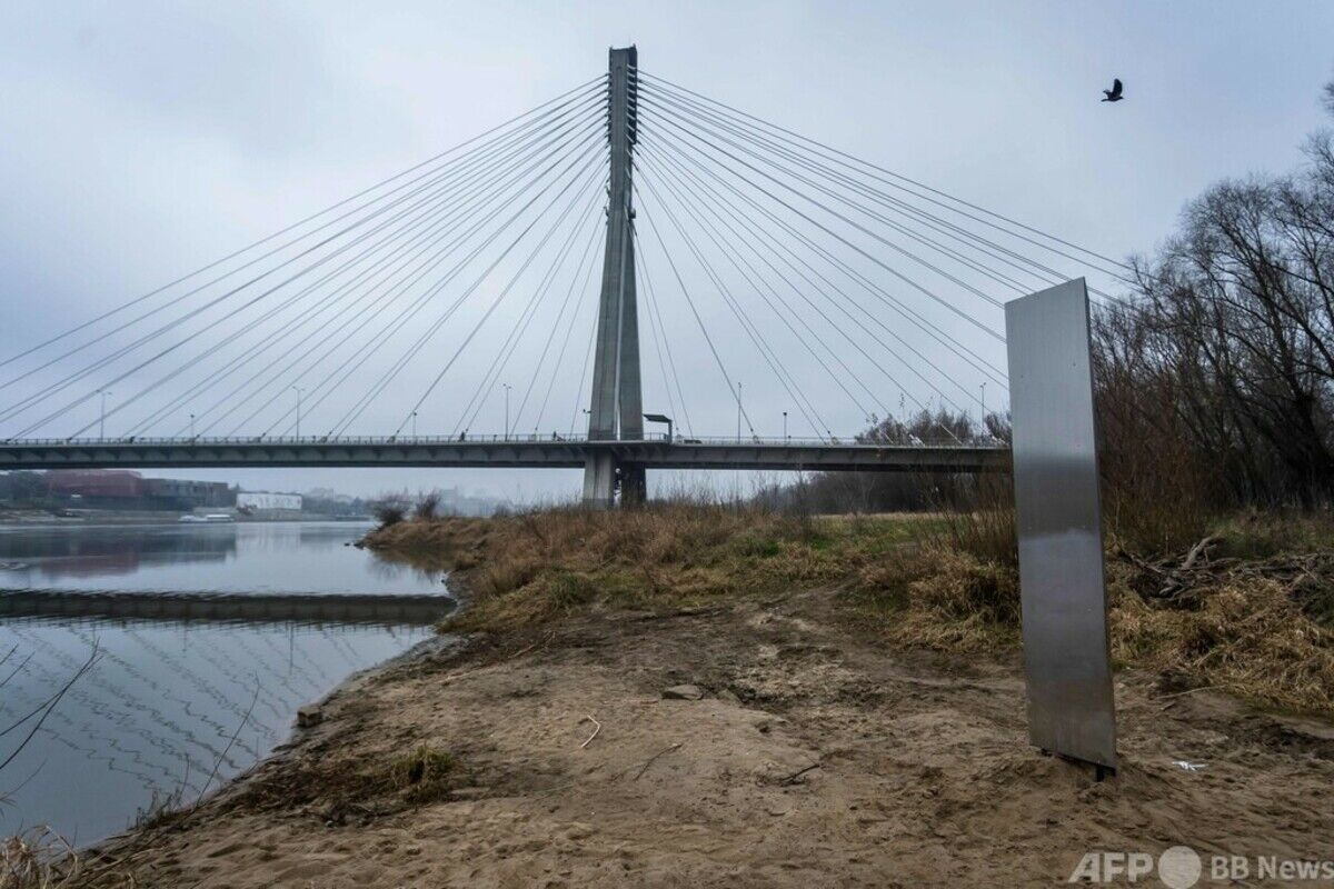 ポーランドの「モノリス」は、首都ワルシャワを流れるビスワ(Vistula)川のそばで見つかった。高さ約3メートルで、川岸の砂の中に立てられている。