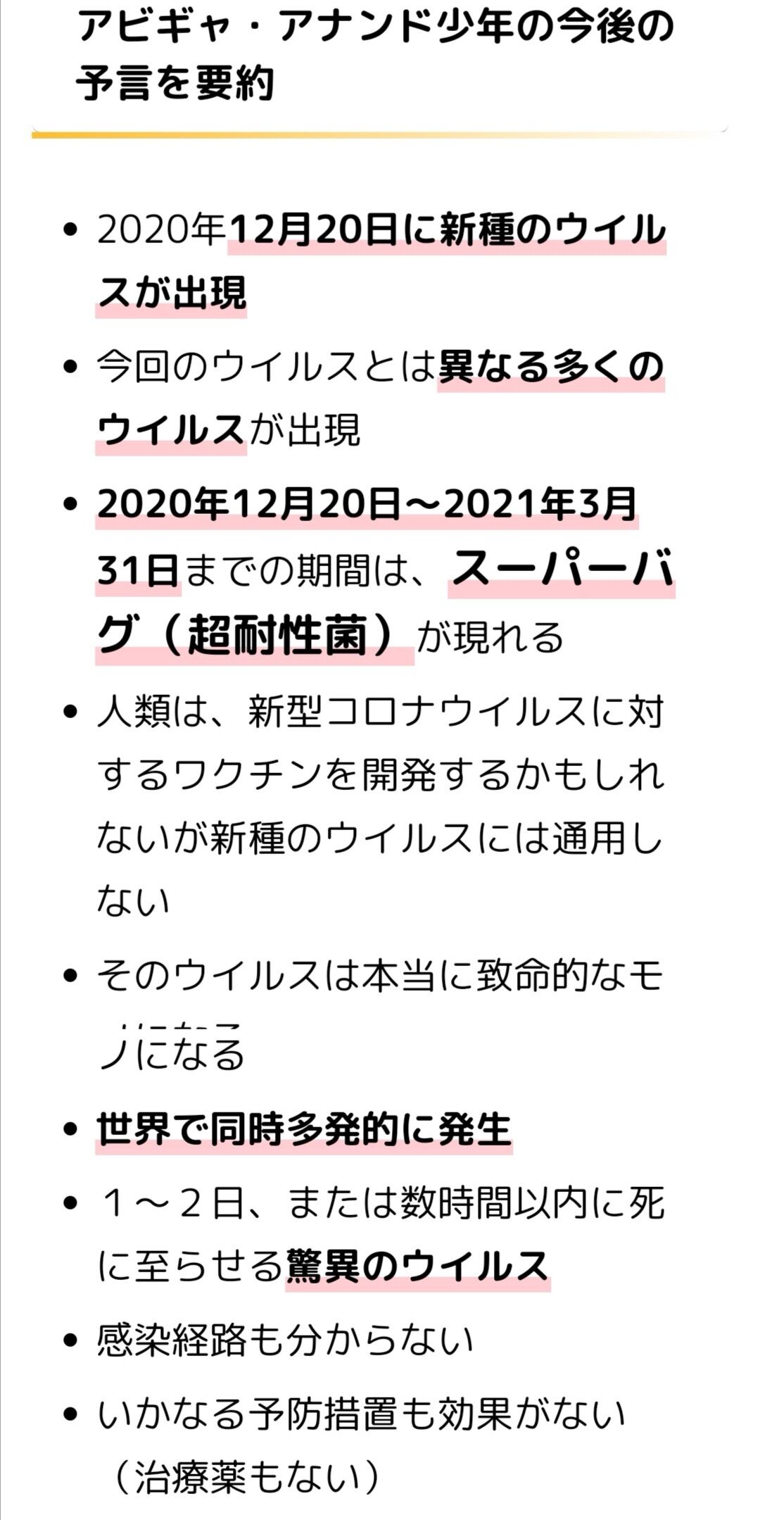「アナンド少年は占星術で新型コロナウイルスの出現を占ったといい、6月末までは良い知らせがないと予言。また、人類は最終的にワクチンを開発するかもしれないが、今後、また別の種類のウイルスがやって来て、どんな抗生物質も効かないスーパーバグ(超多剤耐性菌)が現れるとも語っています。より大きな災害は、今年12月20日から来年3月31日まで続くといい、新型コロナウイルスよりも深刻になるといいます。