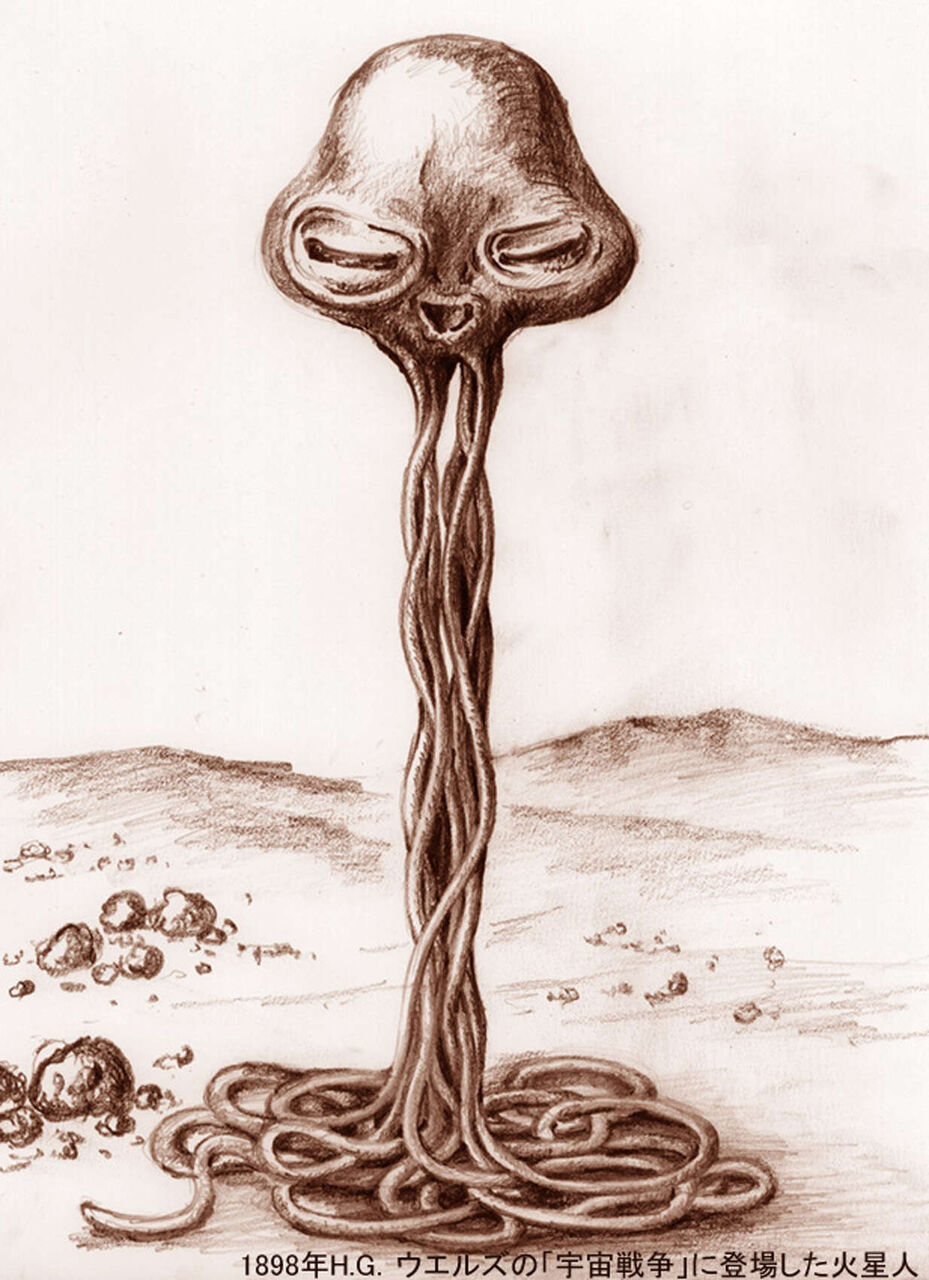 タコ型は作家のウェルズが、宇宙人がいるとしたらおそらく人間とかけ離れた姿をしているだろう、地球上で人間と最もかけ離れているのはタコだ、よしタコをモチーフにしようってなっただけだからな